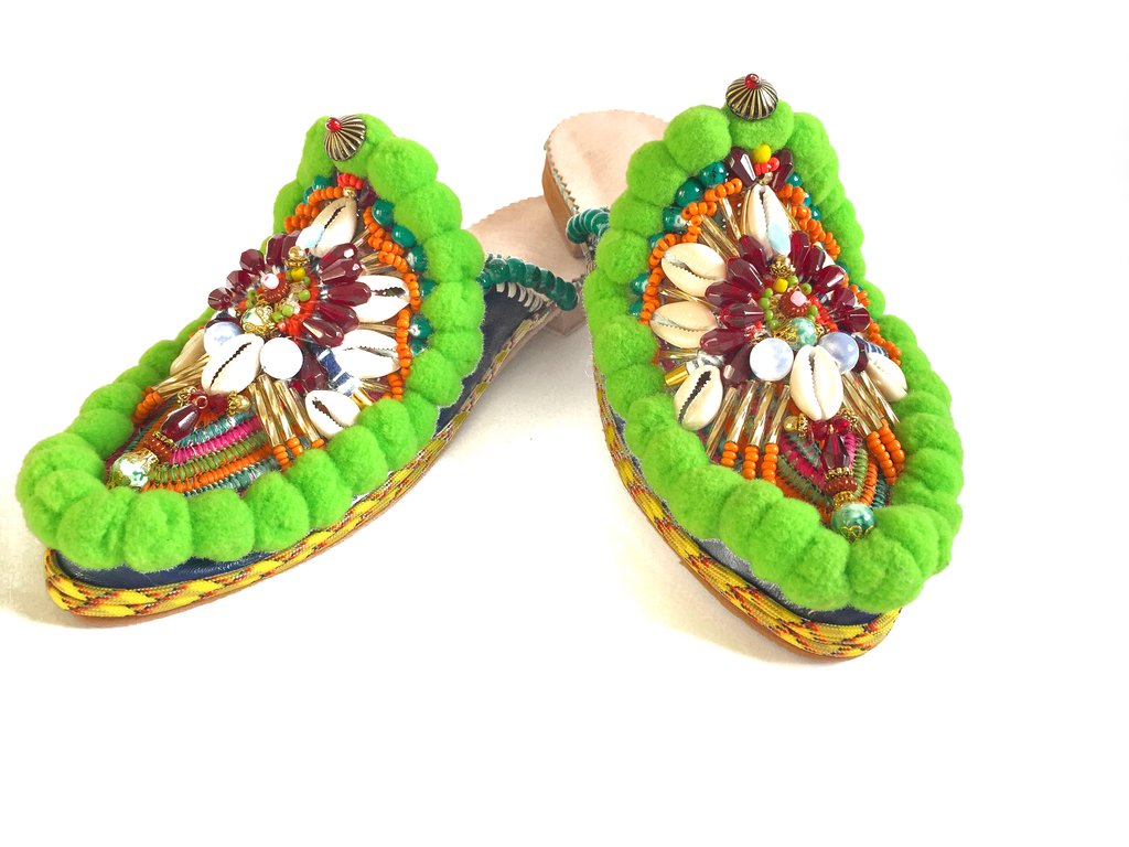 Not only are they the perfect slippers to meet your needs and satisfy your desire for beauty and functionality.They are exquisitely hand-crafted from glass beads, micro glass seed beads, multi-coloured cords, crystal glass beads, cowrie shells, gold plated brass and pom-poms