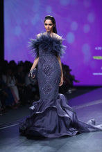 Tanzanite Crystal Ruffle Mermaid Gown with Applique 3 D embroidery.