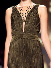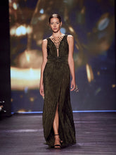 Long dress in pleated jersey, hand embroidered with Swarovski crystals.