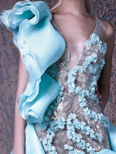 Structured volumes of ruffled organza on a a shimmering lace base, adorned with 3D flower details.
