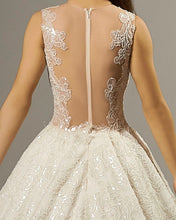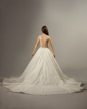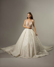 Off-white ball gown in a sheer tattoo effect bodice, with crystals sewn onto a mesh square bodice and throughout the skirt.