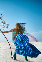 A draped leheriya top and skirt set in indigo with an embellished snug fitted waist festooned in prismatic streaks. It’s paired with a swerved cut blouse embellished in similar streaks overall.