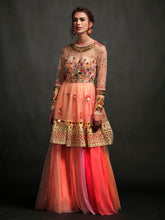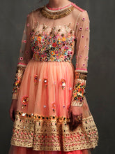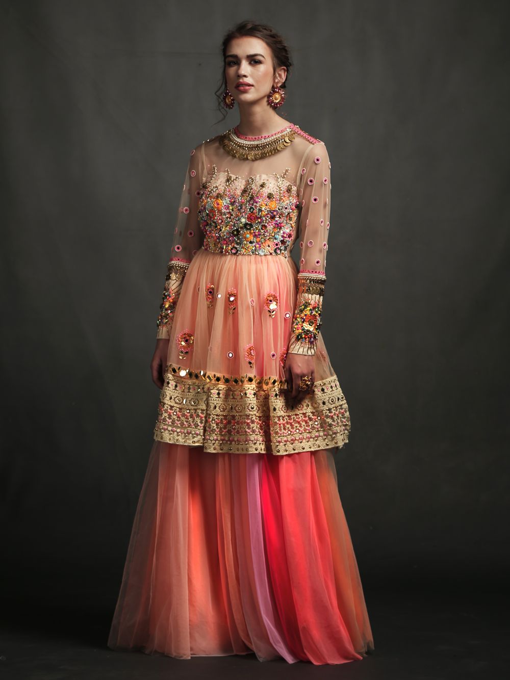 Floral applique blouse with multicolored hand embroidery paired with matchin skirt.