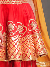 Flowy red applique embroidered tunic with embroidered sharara pants and paired with embroidered dupatta.