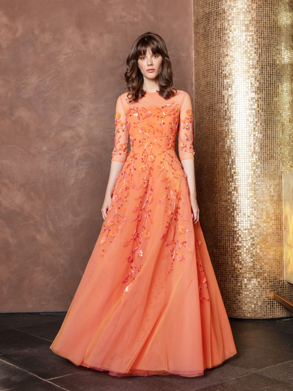 Floral embellished layered tulle evening gown.